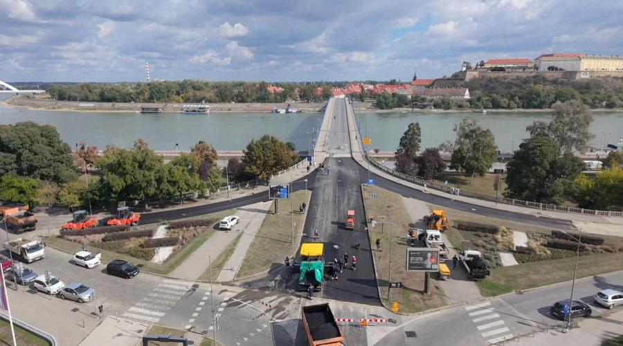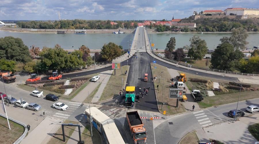 Наставак радова на поправци коловоза даље ће се одвијати фазно, на навозима моста.  Наредних дана радови ће се изводити на Тргу незнаног јунака (десна страна гледано из правца Петроварадина ка центру града), те ће бити онемогућено скретање десно са Београдског кеја ка Булевару Михајла Пупина и Улици војводе Путника, као и са моста ка Кеју.